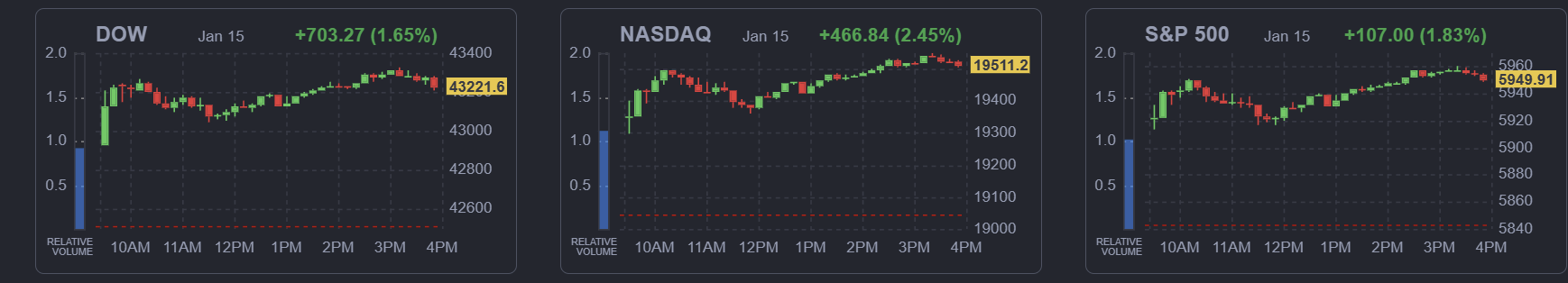 1월 15일 수요일(현지시각) 미국 증시 요약