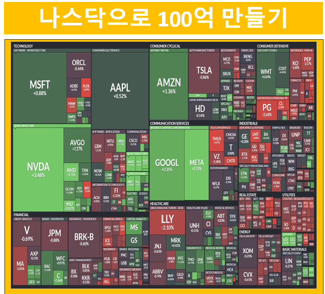 안녕하세요. 미국 나스닥 투자로 100억을 꿈꾸고 있는 머니맨입니다! 오늘 미국 뉴욕증시는 반도체 주식의 급등으로 인해 기술주 중심의 나스닥이 1.2% 상승하며 마감했습니다. 반면, 다우지수는 금리 급등 영향으로 하락했습니다. 그런 가운데 대만의 세계 최대 전자기기 위탁생산업체 폭스콘이 인공지능(AI) 서버 수요 증가로 역대 최고 수준의 호실적을 발표하면서 관련 종목들이 상승세를 보였습니다. 오늘 미국 증시의 상승으로 제 계좌는 13억을 다시 돌파했습니다.