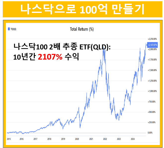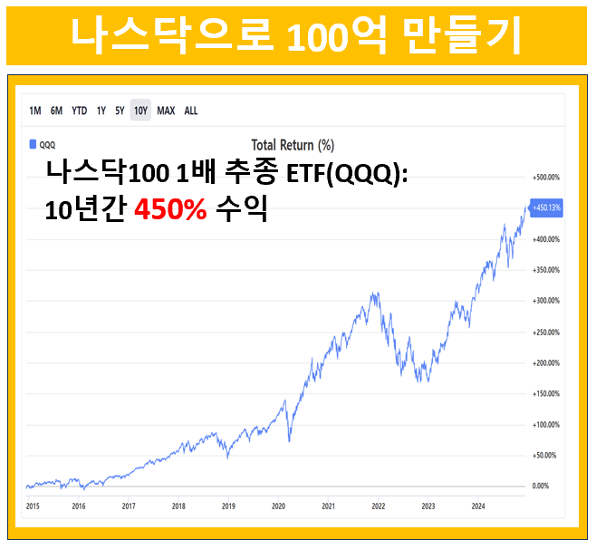 나스닥 100 인덱스를 1배로 추종하는 QQQ는 지난 10년간 450% 상승했습니다. 10녀 전에 1억을 투자했다면 수익금만 4억 5천만원이겠네요.