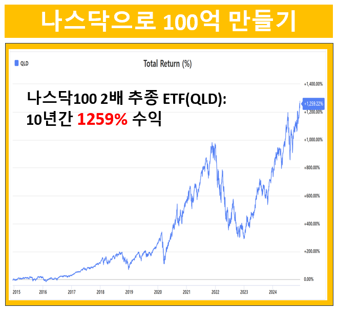 나스닥 100 인덱스를 2배로 추종하는 QLD 입니다. 지난 10년간의 수익률은 1259%입니다. 엄청난 상승인데요. 10년 전에 1억을 투자했다면 현재 12억 5900만원 수익 중입니다.