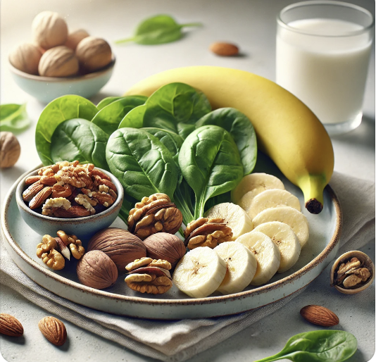 (5)생리통 완화에 도움이 되는 음식 섭취: 마그네슘이 풍부한 음식은 자궁 근육을 이완시키는 데 도움을 줄 수 있어요. 아몬드, 호두, 바나나, 시금치 같은 음식이 마그네슘을 많이 함유하고 있어요. 또한, 오메가-3 지방산이 풍부한 연어나 참치도 염증을 줄이는 효과가 있어 생리통 완화에 도움이 됩니다.