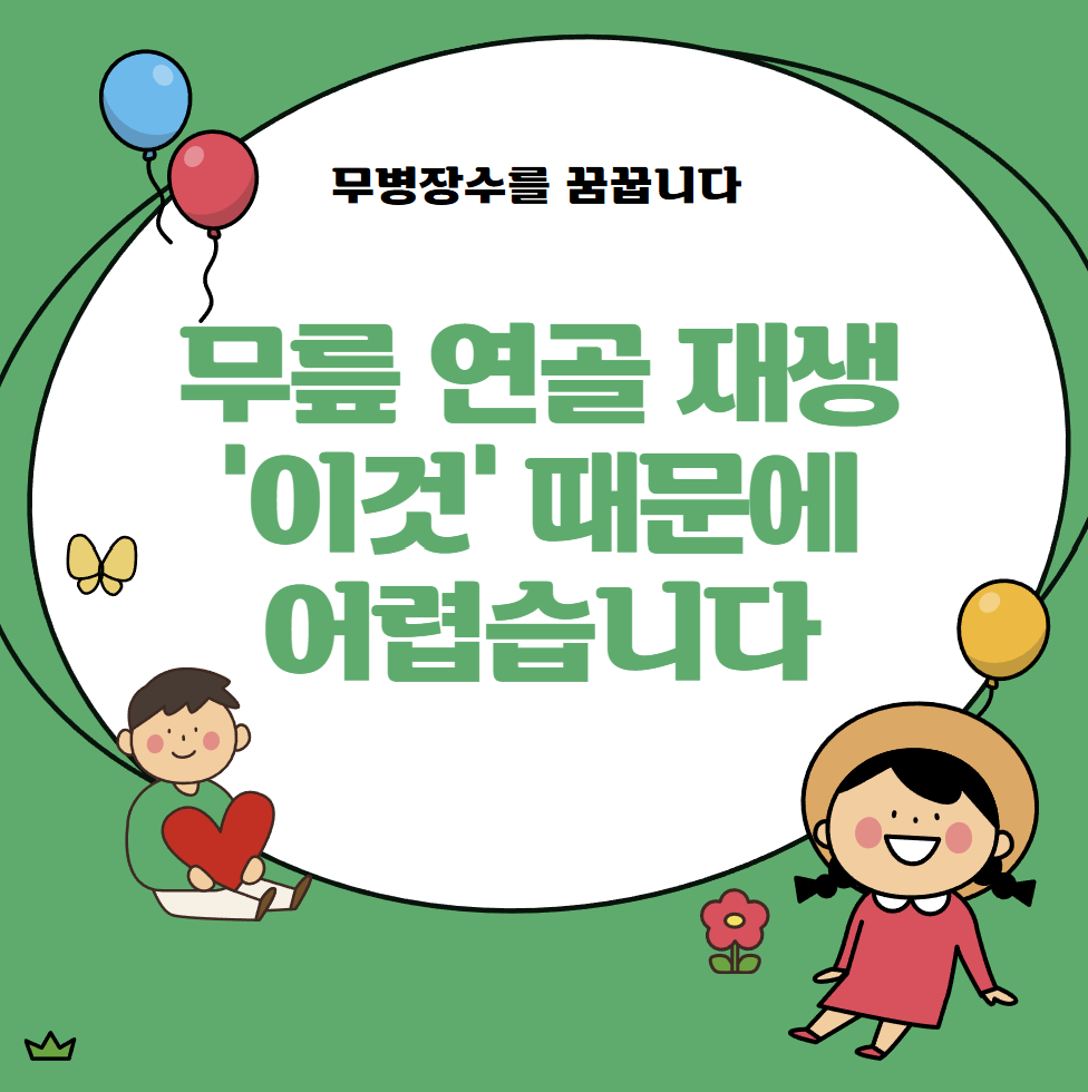 결론적으로, 연골 재생이 어려운 이유는 혈관이 없어서 손상된 조직으로 영양분과 세포가 제대로 공급되지 못하고, 연골세포 자체가 치유 능력이 거의 없기 때문입니다.