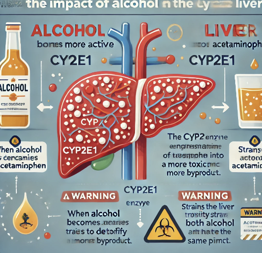 술을 마시면 간에 존재하는 CYP2E1이라는 효소가 활성화돼요. 이 효소는 아세트아미노펜을 더욱 독성 있는 부산물로 변환시키기 때문에, 알코올이 간에서 해독되는 동안 아세트아미노펜이 독성을 증가시키고 간에 부담을 줘요.