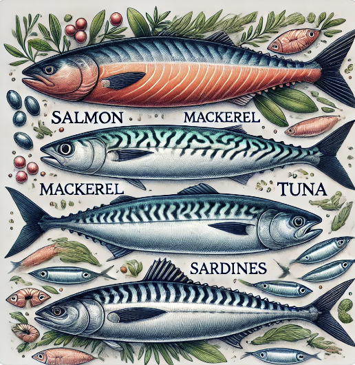 (1)오메가-3 지방산: 오메가-3는 염증을 줄이고 혈중 트라이글리세리드(중성지방)를 낮추며, 혈관을 보호하는 데 도움이 됩니다. 대표적인 음식으로는 연어, 고등어, 참치, 정어리 같은 지방이 많은 생선이 있으며, 매주 2~3회 섭취하는 것이 좋습니다.